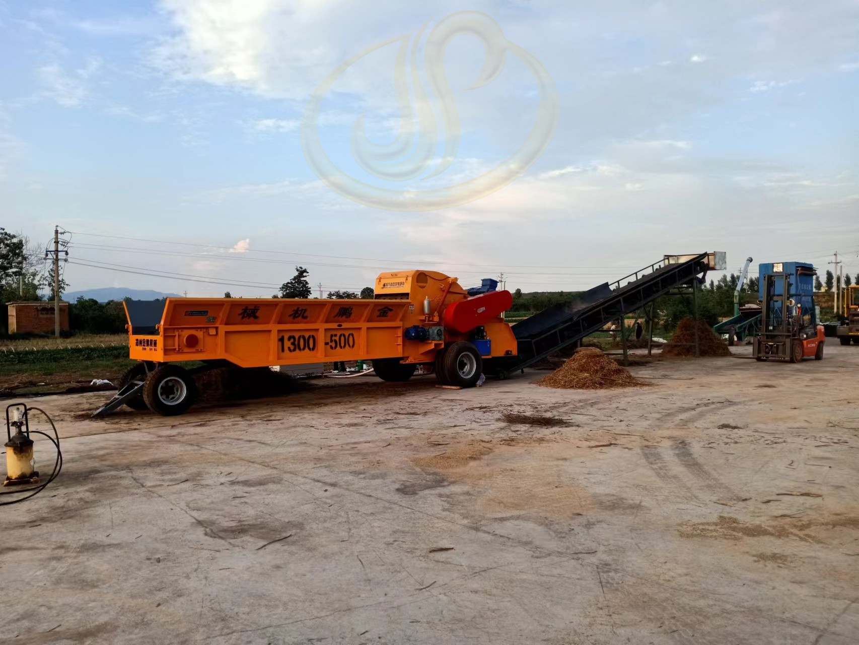 在破碎過程中,樹枝進入設備內部后被不斷沖擊和剪切,逐漸變成較均勻的木屑。出料通過輸送帶排出,在設備后方形成堆料。